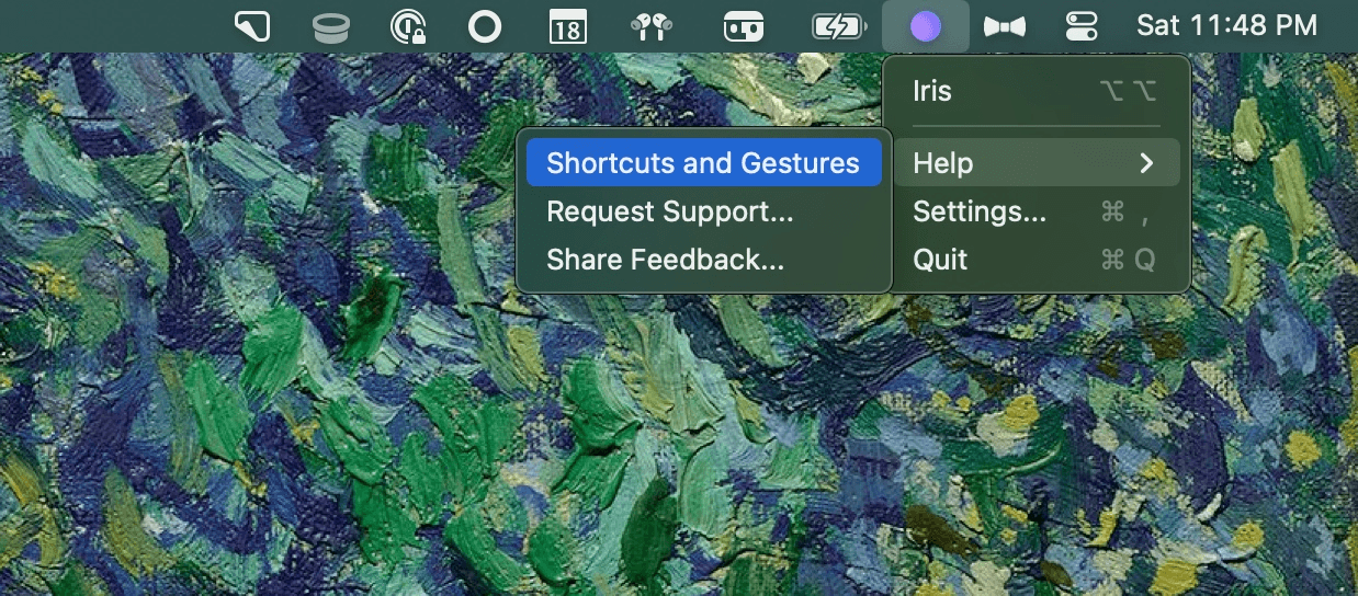 You can always view Iris shortcuts and gestures from the help menu:
